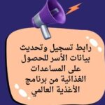 يعلن برنامج الأغذية العالمي عن فتح باب تسجيل وتحديث بيانات الأسر لتحسين نظام توزيع المساعدات الغذائية وضمان وصولها للفئات المستحقة بعدالة. تعليمات هامة يجب ادخال